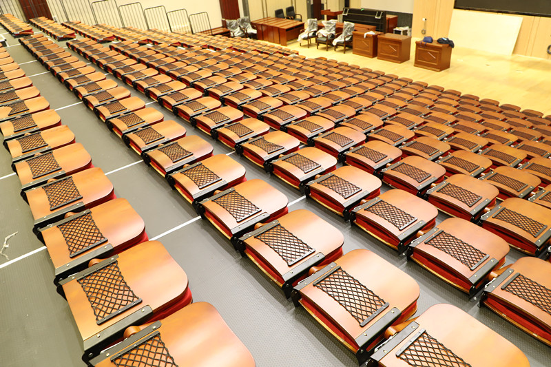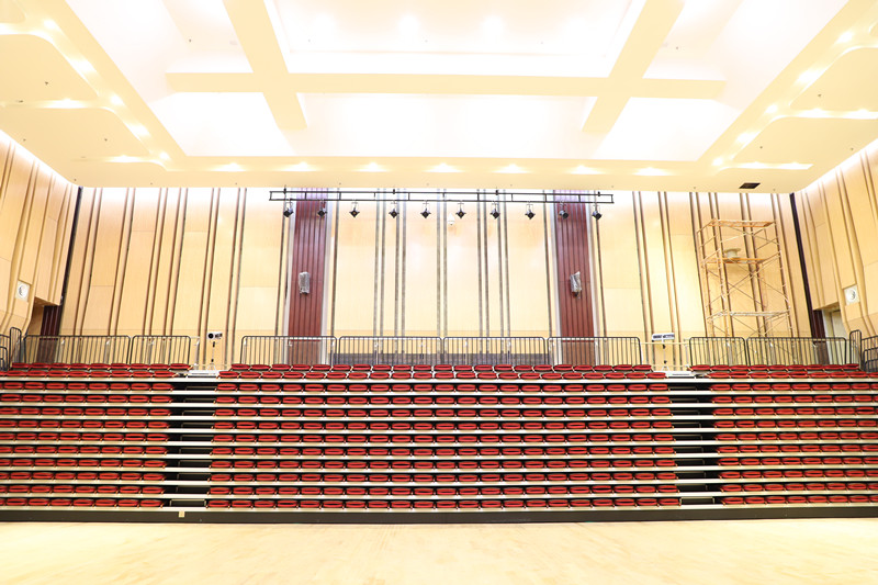 该看台为电动伸缩看台,配置前置式包棉软包座椅,带扶手,为满足客户特殊需求,在座椅背面增加网兜设计。看台整体与多功能厅其他设施搭配合理,整体美观大方。