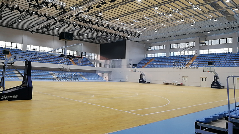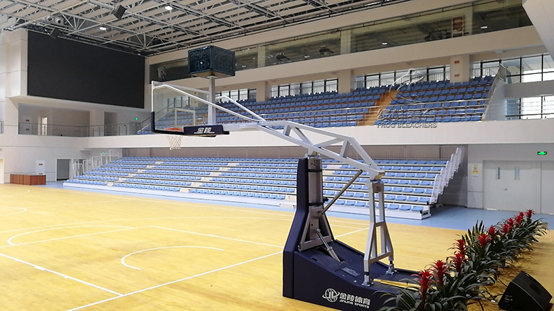 为什么会选择前置式低靠背伸缩看台呢?因为伸缩看台收拢时占地小,展开时能容纳大量观众,为了实现场馆多功能利用以及经济考虑,伸缩看台是一种很好的选择。