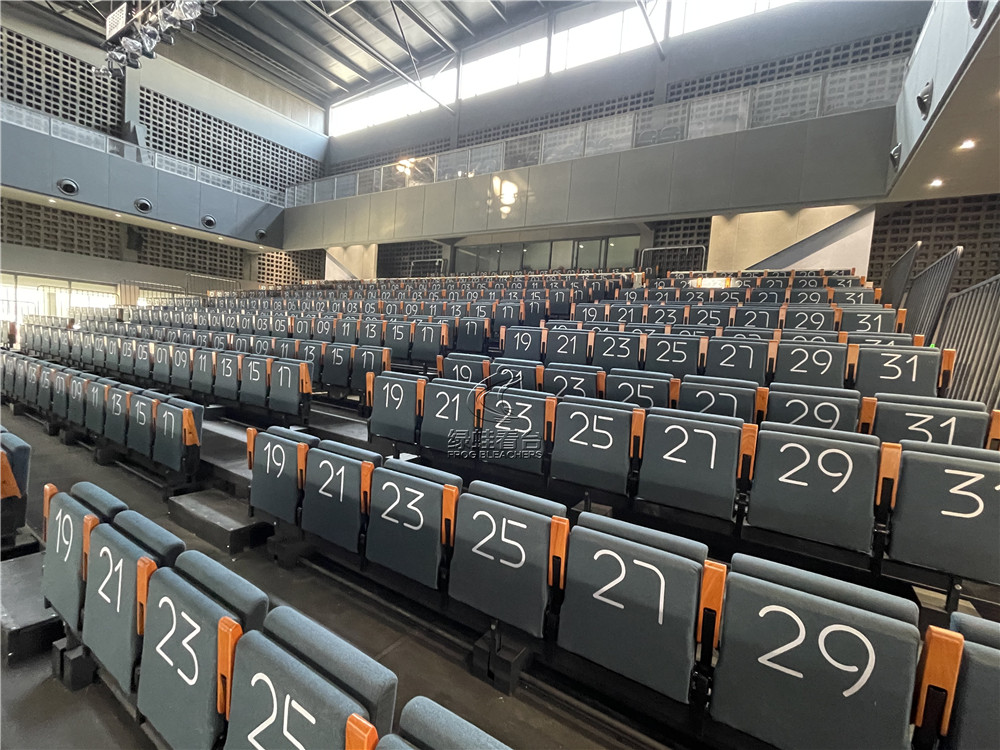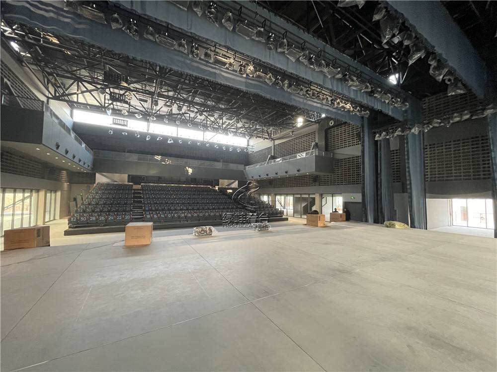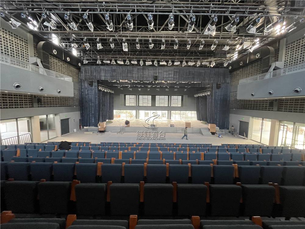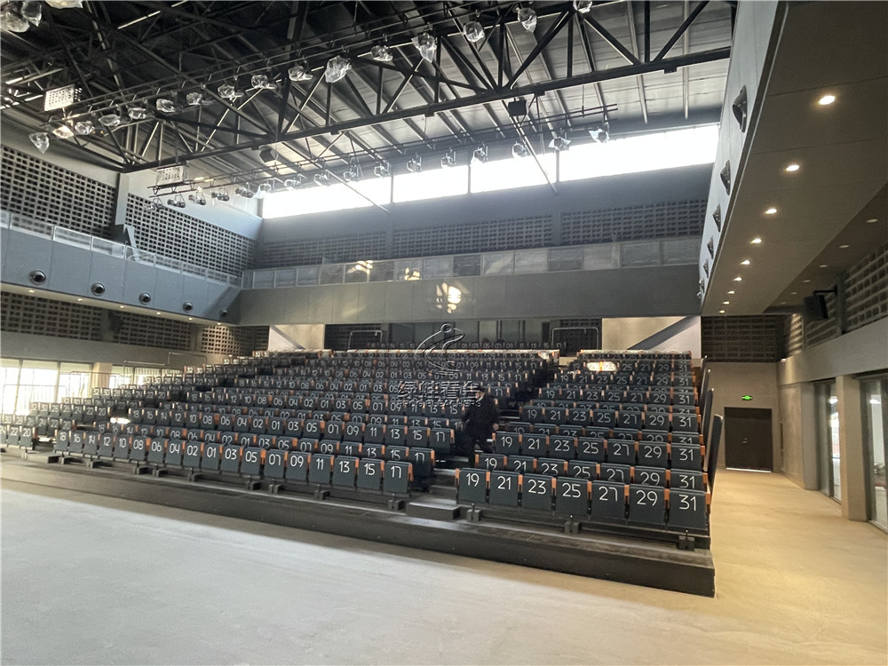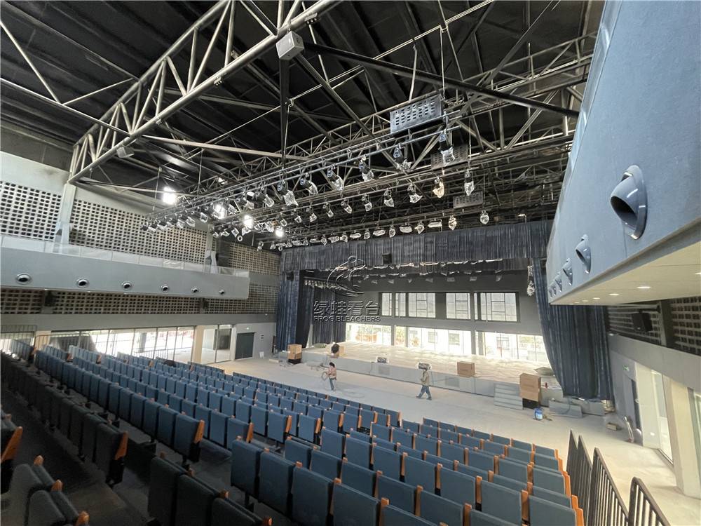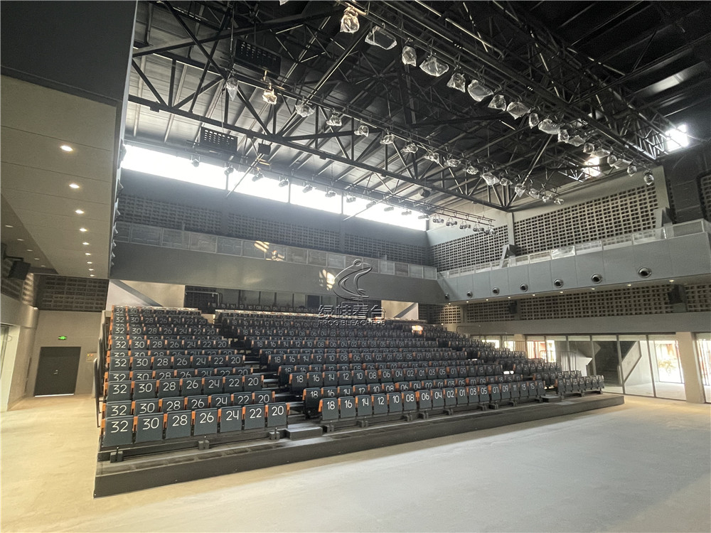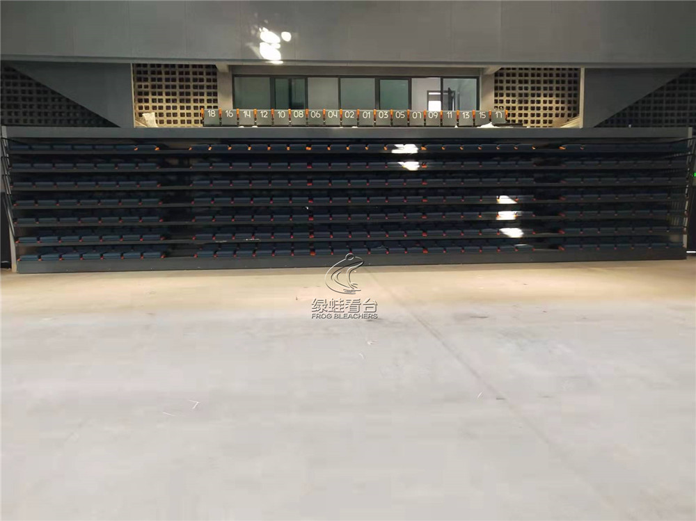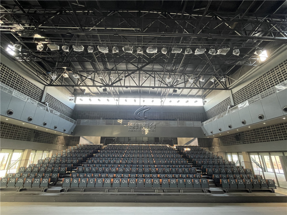 绿蛙看台承接了郑州彩虹盒子艺术园的室内电动看台座椅安装调试项目,采用了一层双排后置式软包电动伸缩看台,共448位(踏步20级),最大化的利用空间面积,同时兼顾观众的使用体验及安全性能。