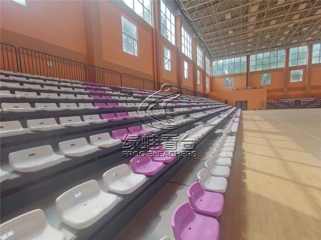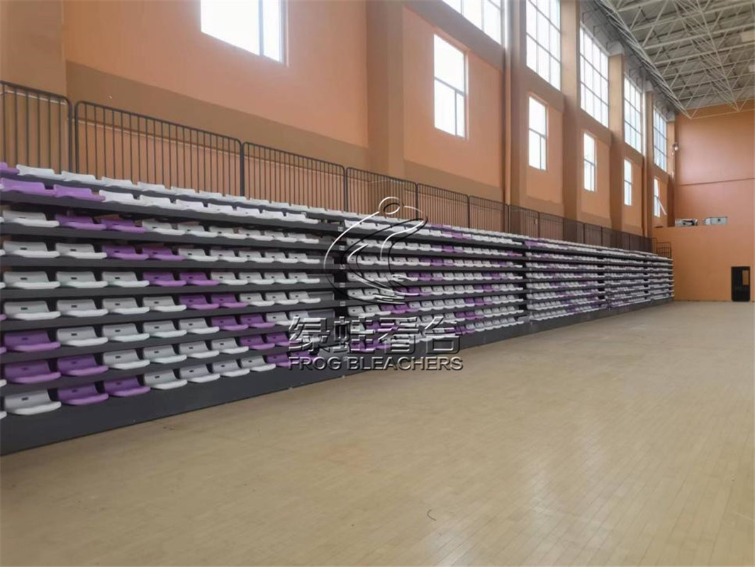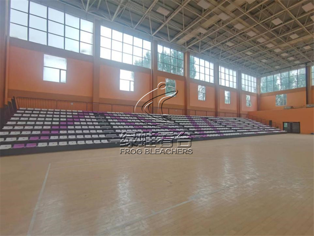 在技术方面,活动看台采用钢焊接组装连接,所有安装用钢件均采用静电喷涂处理,层宽800mm。首层高330mm,错层高300mm, 活动看台踏板材料选用17mm防火防滑舞台板,活动看台为电动控制,保证左右行走距离一致,在伸展与回缩中无定向跑偏、卡死、打滑、跳齿现象,后边和侧边(第一层除外)加安全防护栏杆,栏杆高度为1100mm。