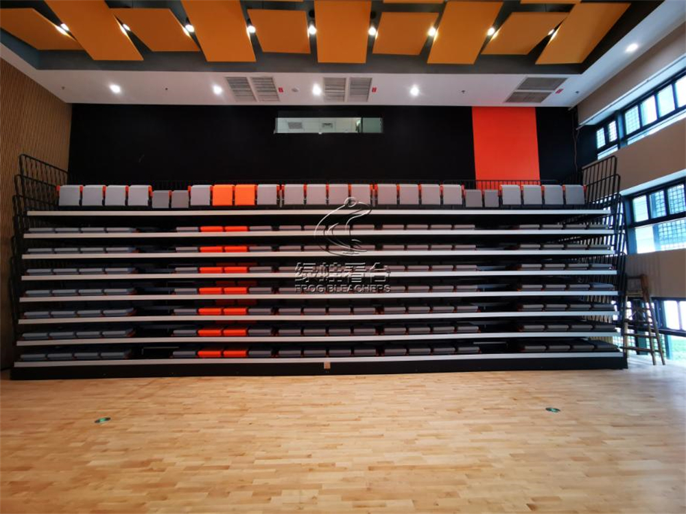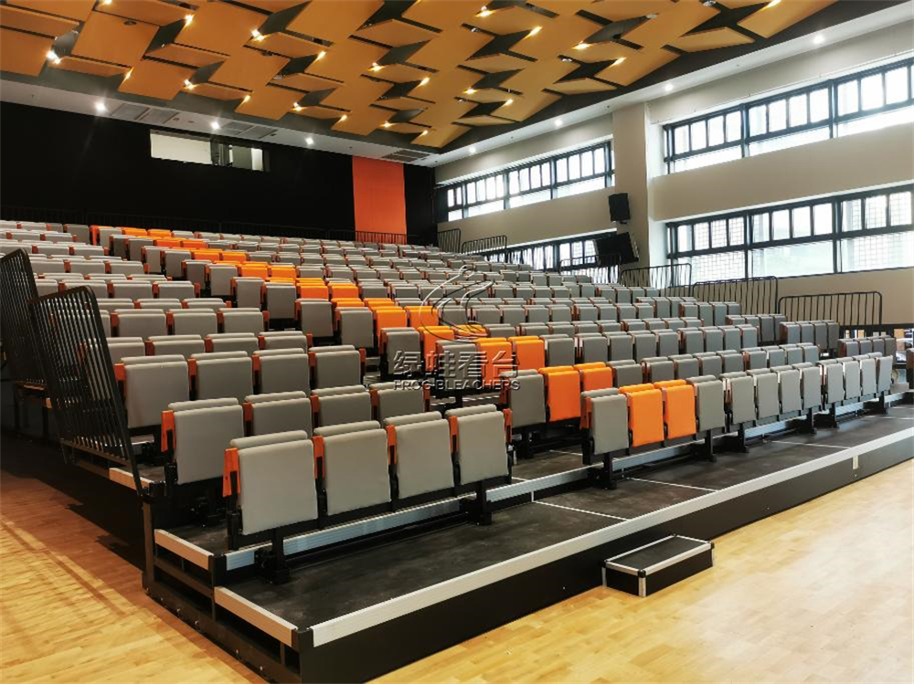 看台座椅通过脚踩全部仆倒,然后通过遥控,可一层层收回。看台收拢以后,全部深度只剩2米多,腾出了大部分的空间,以方便其他教学场景使用。
