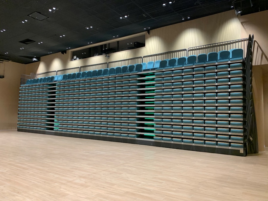 看台总共是13排,可容纳观众394人。上面配置有两条通道。通道上面的踏步上装有灯带,方便在光线昏暗的情况下观众的出入。看台收拢后的深度只有1.5米,整体像一面墙一样壮观。看台收拢后腾出了巨大的空间,可以做其他的功能使用,大大增加了场地的使用效率。