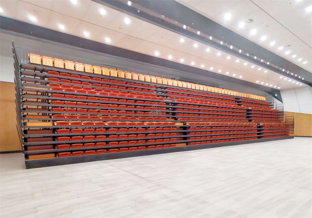 看台层宽950mm,首层高330mm,错层高300mm,看台踏板材料选用17mm夹层板,表面颜色为木色;伸缩看台为电动控制,保证左右行走距离一致,在伸展与回缩中无定向跑偏、卡死、打滑、跳齿现象