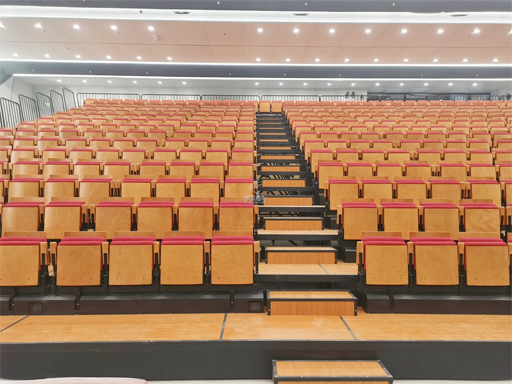 伸缩看台座椅采用软包座椅,带扶手,座包和背包车线条,外挂弧面油漆板,靠背油漆板外凸,中间位置装座号,后置式安装方式。