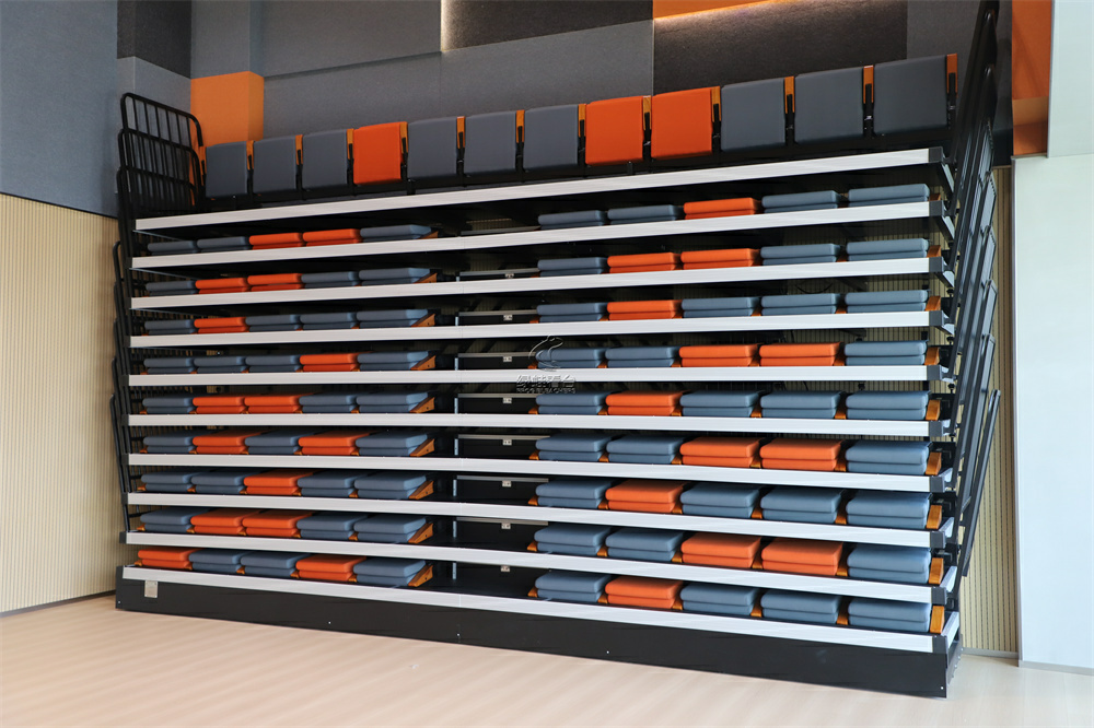 伸缩看台整体为10层,电动,配置后置式软包座椅,颜色搭配选择灰和橙色,与室内的吸音墙颜色高度协调。