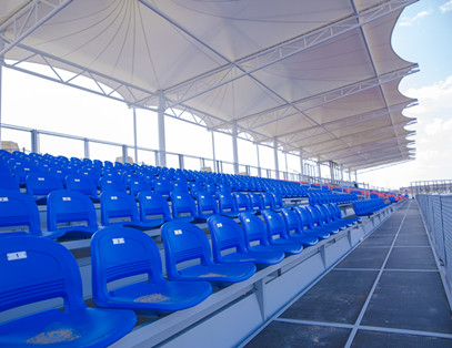 该看台项目用于二连浩特旅游局举办的旅游节开幕式看台。看台采用可拆卸式结构,座椅采用高靠背中空吹塑椅,护栏采用绿蛙新型网状护栏。二连浩特该季节蓝天比较多,太阳照射紫外线强,专门为看台制作了张拉膜顶棚,安全、实用、美观大方。