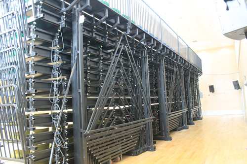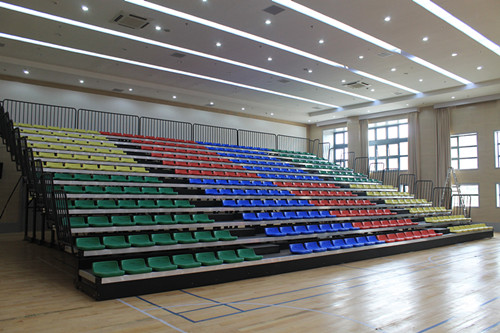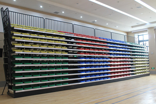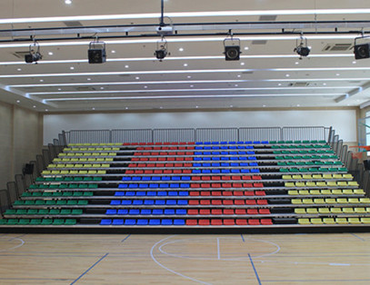 广州开发区第一幼儿园,多功能厅,看台采用电动低靠背伸缩看台,看台共12层,座椅颜色采用4色把大块,与幼儿园LOGO主题色相匹配,看台整体美观。