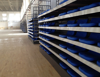 该看台为电动伸缩看台和轮式可翻转看台组合,可以满足场地的多功能使用。当使用中间的篮球场地进行比赛时,伸缩看台全部展开,轮式可翻转看台置于篮球场南北两侧,可满足800人的观众座位数。