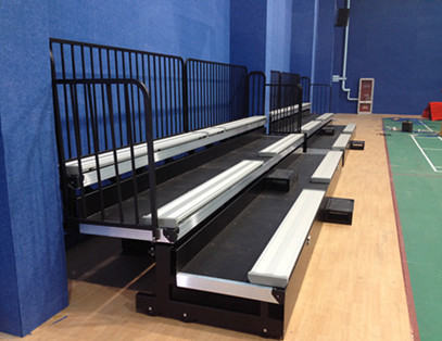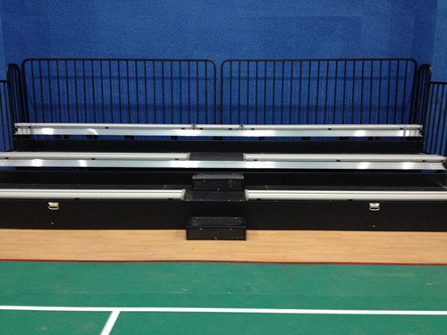该看台为三层手动伸缩看台,看台采用绿蛙特有导轨结构,伸缩流程。看台整体采用亮光黑颜色,再配以金属原色的铝合金座板与铝合金封边条,形成强烈反差,并与羽毛球场地颜色相得益彰,整体美观大方。