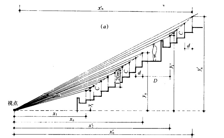 e—视点高度 (坐时为 1200mm ,站时为 1600mm) ;