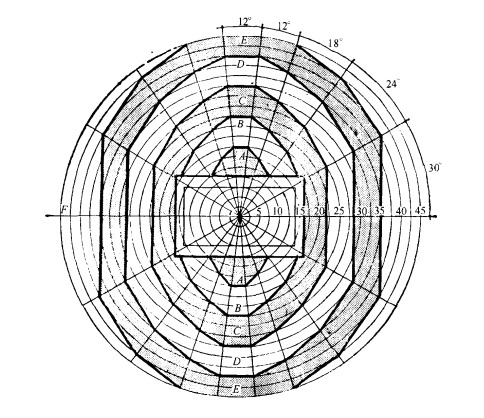 1)视角:观众视线与视平线之间的夹角,分为水平视角和垂直视角两种。 最佳视角是确保视线质量的重要因素。一般来说视角高度角不宜超过45度,最低不宜低于5度。水平方位角由于体育馆比赛 场地是长方形,从观众入席实测记录表明,座席视距大小,高角度的大小(楼厢高度角较堂厢高度视觉质量差)是影响观 众座席视觉质量的主要因素。