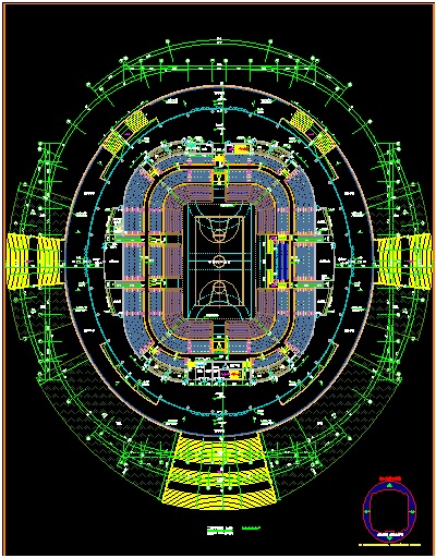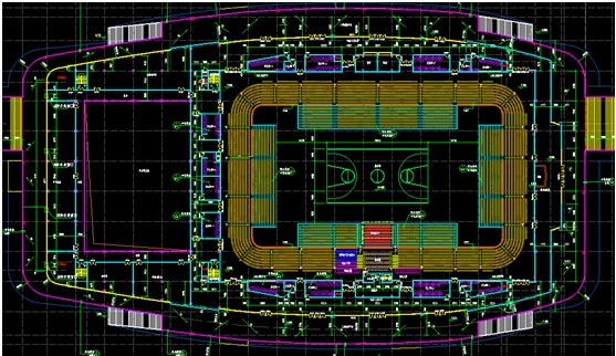 1)长方形平面:长方形平面的优点是外形简洁、结构简单,场地纵向两侧看台视 线好、容量大、基本能按最佳视线位置安排座席,适用于看台边线为长方形,场地纵轴两侧或一侧为主看台的中小型馆。
