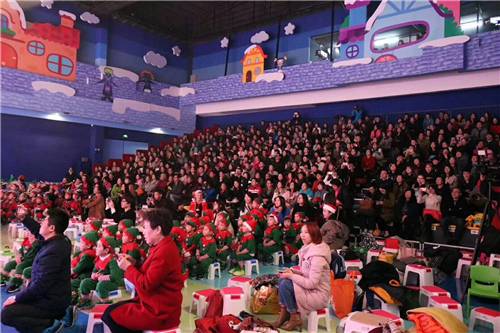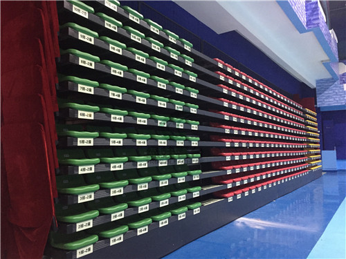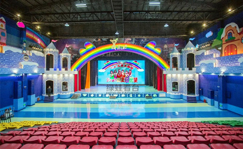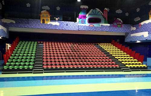 亚特兰亲子酒店的BIBI欢乐城堡里选用的中空吹塑低靠背电动伸缩看台,看台共有12层,最大限度的利用场地来满足观众观看节目需求。