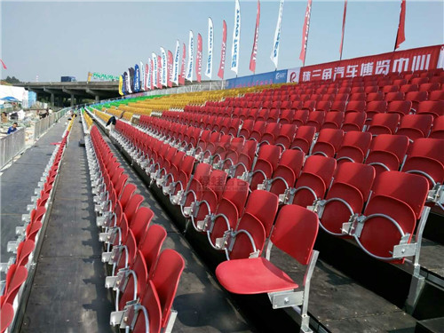 该赛场的看台选用我司的可拆卸拼装临时租赁看台,其设计为12层,可容纳2000人的观众,看台首层起高1.2米,视野开阔,精彩节目一览无余。看台层与层之间钢板封闭,观众站在看台上完全见不到地面,从而没有任何站在高处的恐惧感。