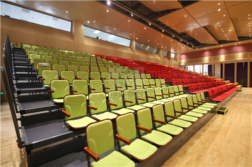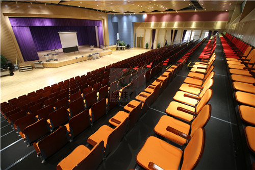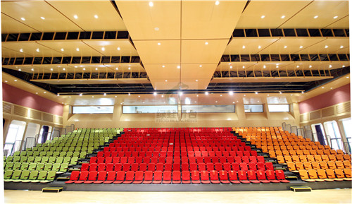 绿蛙看台与乐湾国际实验小学的多功能厅浑然一体的结合,座椅颜色是选用俏皮的暖色系,贴切校园的文化气息,整个演播厅熠熠生辉,活力四射。