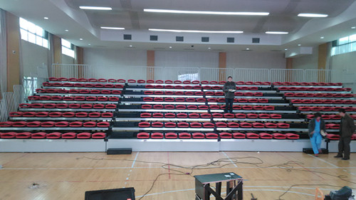 学校体育馆常举办活动,观众看台基本采用普通椅子,在校方领导指示下,经商议采用绿蛙公司可移动伸缩看台,用时展开,不用时收在墙角。