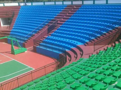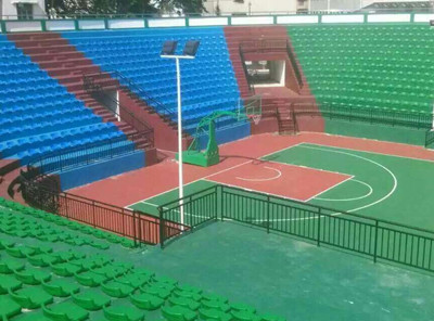 海南五指山体育场看台看台座椅完美收工。该篮球场看台采用低靠背座椅,四周看台基础为水泥台阶,刷彩色油漆,间篮球场地采用硅PU,三者颜色互相呼应,整体美观大方。乃户外篮球场地上乘之作!