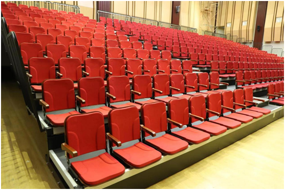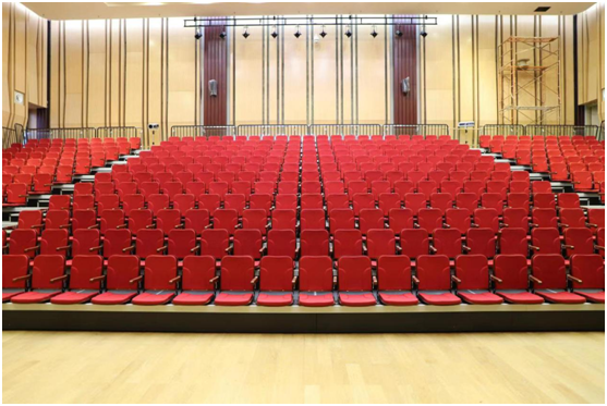 绿蛙看台为学术交流中心配置了前置式包绵软包座椅带扶手的电动伸缩看台,为满足客户特殊需求,在座椅背面还增加了网兜设计。配合交流中心庄严的设计,大气整洁的看台为这个“舞台”增添了又一种色彩。