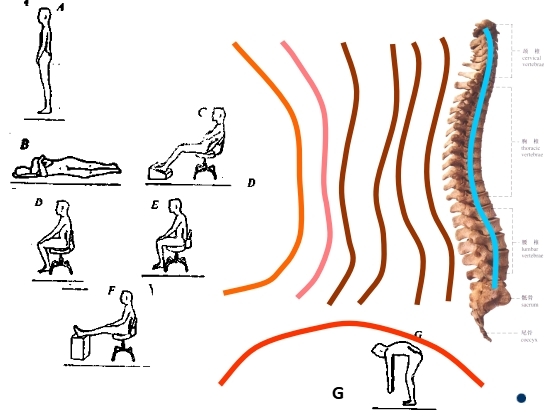 2.2、当处于非自然姿时,椎间盘内压力分布不正常,形成的压力梯度,严重的会将椎间盘从腰椎之间挤出来,压迫中枢神,产生腰部酸痛、疲劳等不适感。躯干完全挺直的坐姿使脊椎严重弯曲,因椎间盘上压力不能正常分布,身体上部的负荷加在腰椎部,引起不适,因此90度角的靠背椅是不良的设计,躯干前倾的姿势会使本来前凸的腰椎拉直甚至反向后凹,这种姿势因而也极不舒服,影响了胸椎和颈椎的正常弯曲,使颈、背部疲劳.