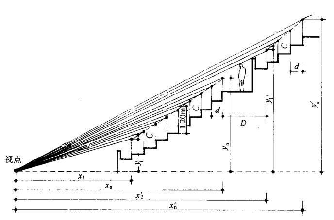很明显,如果在我们的设计实践中,采用了C值每两排36.5公分,则看台的高度将是73公尺,这样的高度是不合理的,这种选择C值的方法也是很片面的,因为这样的结果仅照顾了视线无阻碍性而忽略了由于C值太大,看台坡度陡建筑物太高而造成的深度视觉、观众集散和经济等一系列严及问题。