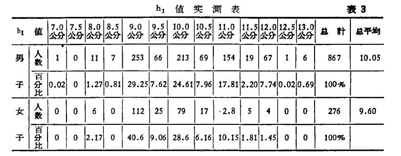 h1值是决定C值的重要组成部分,目前一般都认为是12公分。这些数字都是从国外资料中得来的,为了求得我国人体的h1值,对1143名人员进行了实测,其对象选择为青少年和成年人,实测记录见表3: