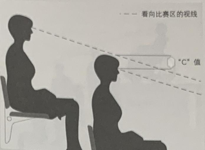 视线一词指的一个观众越过下面观众头顶看到比赛场地的一个关键点的能力,它是通过“C”来测量的,如下图。