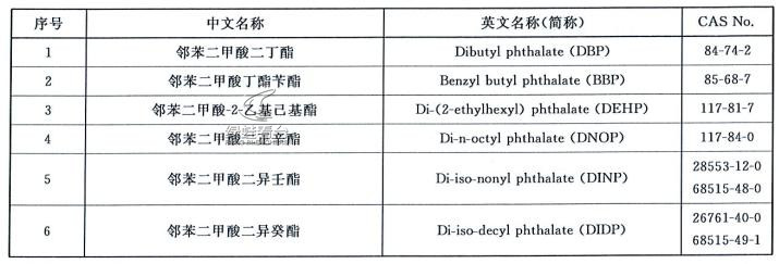 邻苯二甲酸酯,亦称酞酸酯。统称邻苯二甲基酯类。是指主要作为增塑剂使用,PAE类是使用最广泛、品种最多、产量最大的增塑剂。由于邻苯二甲酸酯增塑剂与塑料主体结构之间不以化学键相结合,故在使用过程中会不断从塑料中释放出来,污染环境。邻苯二甲酸酯可通过呼吸道、消化道和皮肤等途径进入人体,是一种重要的内分泌干扰素,会使男性精子数量减少、活动能力下降,干扰男性生殖道的正常发育,增加女性患乳腺癌的概率等。1997年,美国将邻苯二甲酸二甲酯(DMP)、邻苯二甲酸二乙酯(DEP)、邻苯二甲酸二丁酯(DBP)、邻苯二甲酸丁苄酯(BBP)、邻苯二甲酸二乙基乙酯(DEHP)、邻苯二甲酸二正辛酯(DOP)列为优先监测控制的污染物名单。塑料家具有害物质限量标准中的邻苯二甲酸醋指的是下表中的邻苯二甲酸醋。