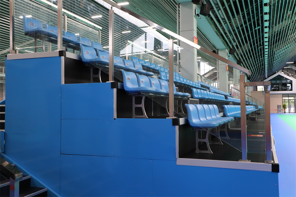 伸缩看台座椅通常由座椅本体、折叠机构、升降装置(对于电动式)以及固定底座或轨道系统组成。座椅本体采用轻质材料制成,表面覆盖阻燃面料,既舒适又安全。折叠机构是实现座椅收纳的关键部件,通过精密的机械设计,允许座椅在展开与收纳状态之间灵活转换。升降装置(如电动推杆)则用于电动伸缩看台座椅的自动升降,提高操作效率。固定底座或轨道系统确保座椅在收纳时稳固不晃动。
