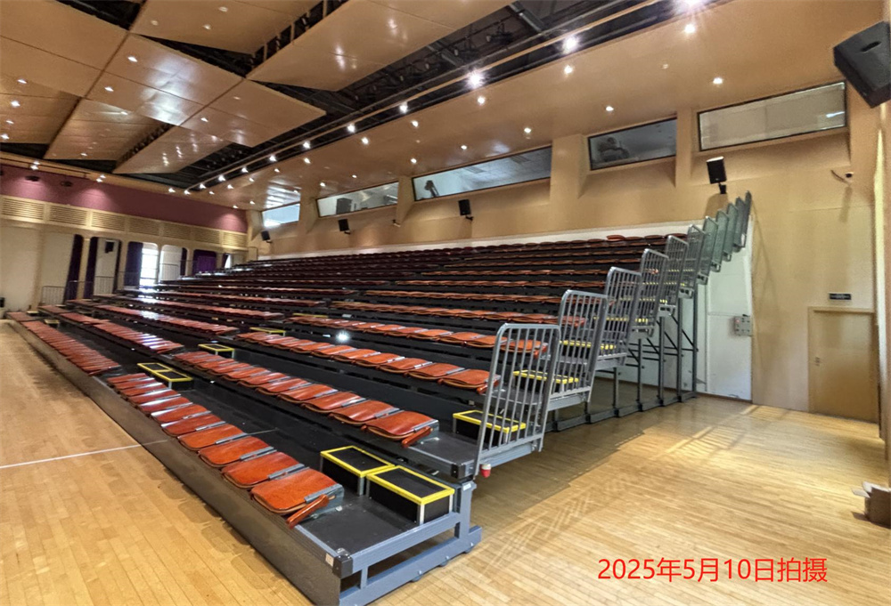 伸缩看台整体为12排,可容纳550人,座椅采用前置式翻板包棉座椅,带扶手。看台展开后可以用作开大会、文艺晚会等活动,看台收拢后,腾出的空间可用作各班级上文体课。