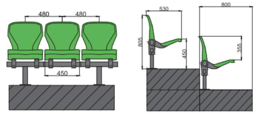 固定看台座椅(绿蛙牌)可分为侧装、立装等不同安装方式的座椅。
