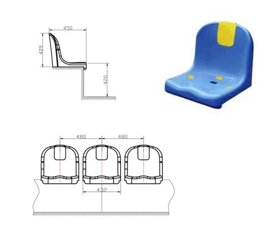 活动看台座椅采用低靠背中空吹塑座椅,前置式安装。座椅座深432mm,座宽450mm,背高409mm。