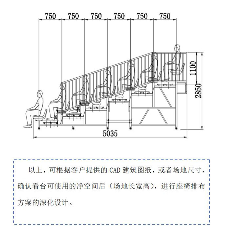 1.看台在满足承载座椅本身重量外,还满足承受下述载荷:每平方米载荷为450kg;每米长可承受左右摆动负载36kg。