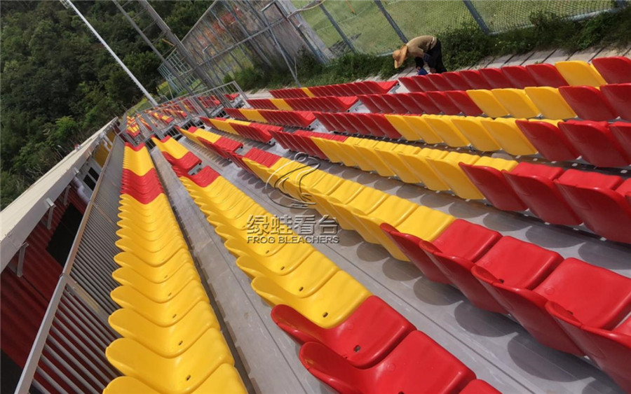 传统的看台大多采用水泥台阶或其他固定建筑结构,在此基础上安装塑料座椅。绿蛙金属看台采用金属支架作为支撑平台,在金属框架上安装塑料座椅。金属看台的优点是选择灵活,可适应不同的场地,看台的安装相比水泥固定台阶更方便,造价更低。看台不需要时拆卸也相对简单,不至于对场地结构造成太大的破坏(Frogsports)。