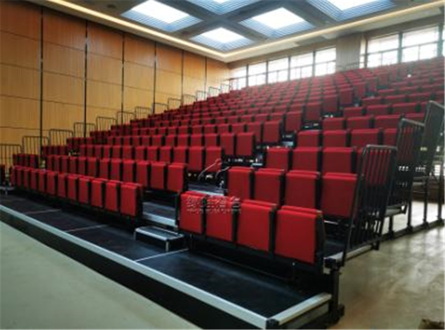 活动看台座椅采用翻板包棉椅,后置式安装。座椅通过专用工具手动整排翻动,翻动过程灵活、轻巧。
