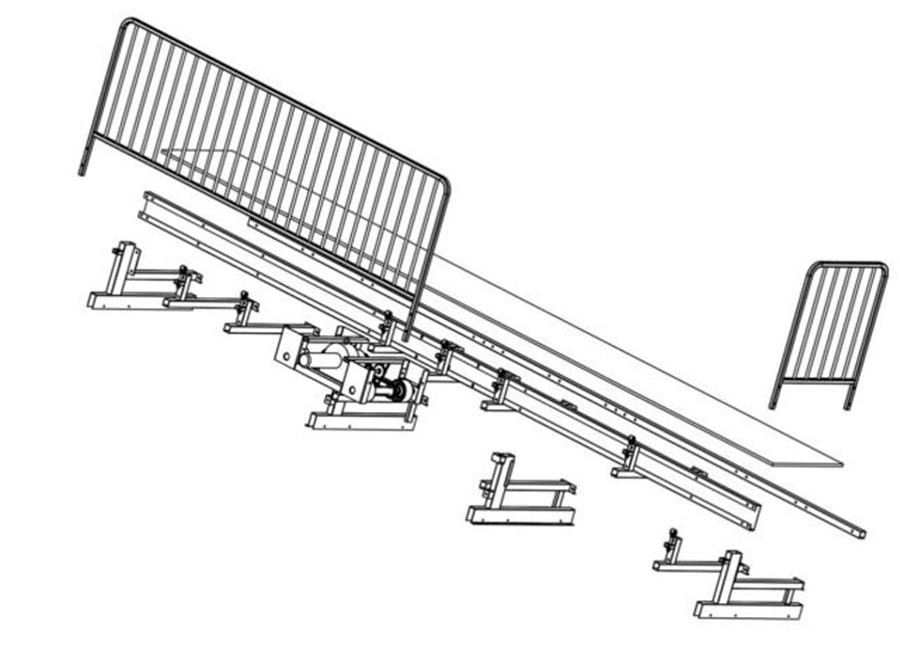 (5)看台力学性能:伸缩看台整体架构应具备较高的、安全的力学性能,台面的承载需满足观众落座的安全要求,并且在观众落座后,横向具有较强的稳定性。台面静载荷应能承受6KN/㎡的载荷30分钟,卸载后无明显变形,无损坏。看台展开后,在静载试验基础上,在正向及侧向分别施加静载360N的水平拉力均布载荷,持续5 min,看台位移量小于活动看台长度的1/200,且不得倾翻。