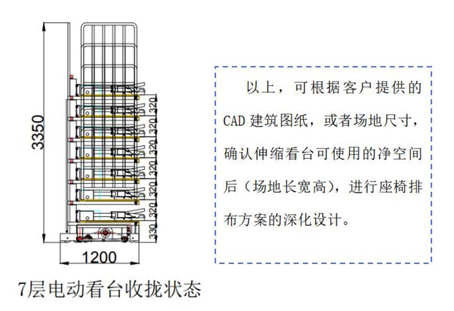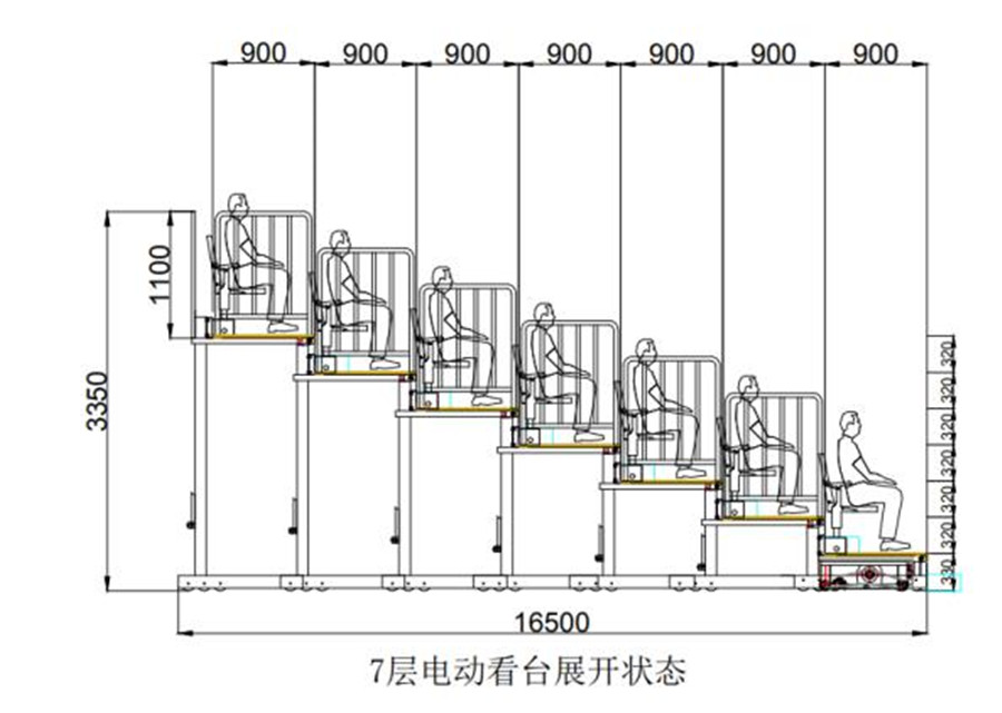 (2)看台整体为垂直支撑结构。看台层宽900mm,尾层宽900mm;首层高330mm,其他层高300mm。(伸缩看台为定制产品,可根据实际场地和客户需求,略微调整尺寸。)