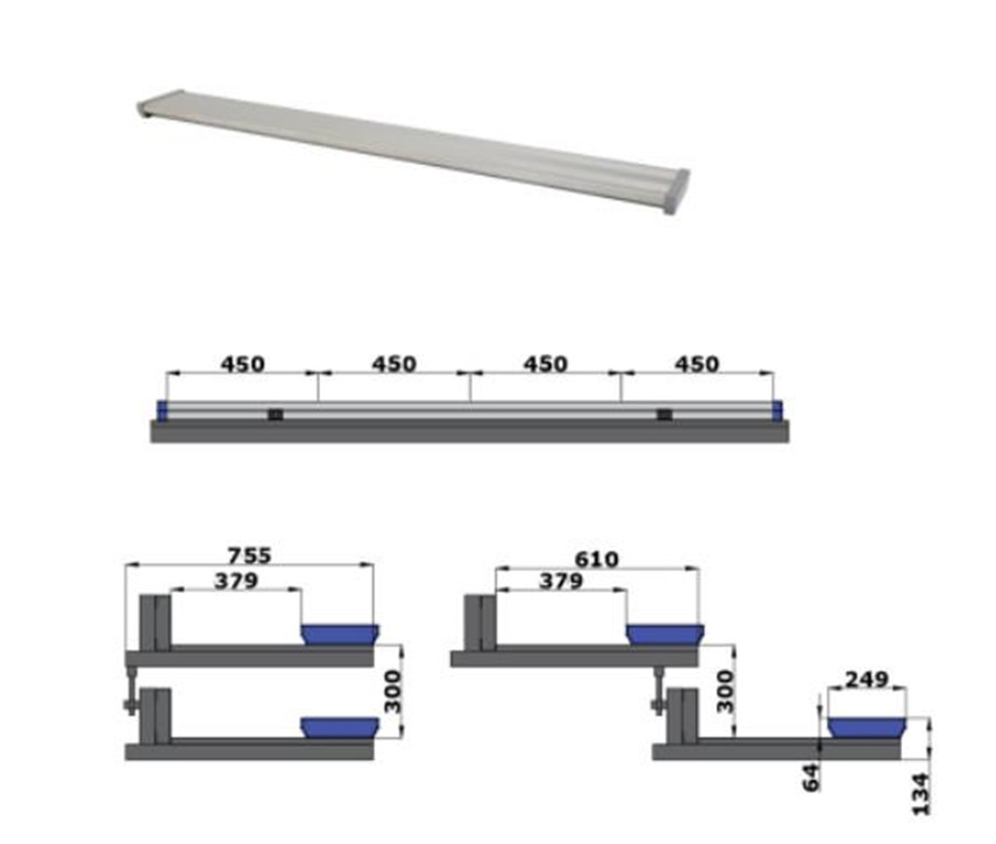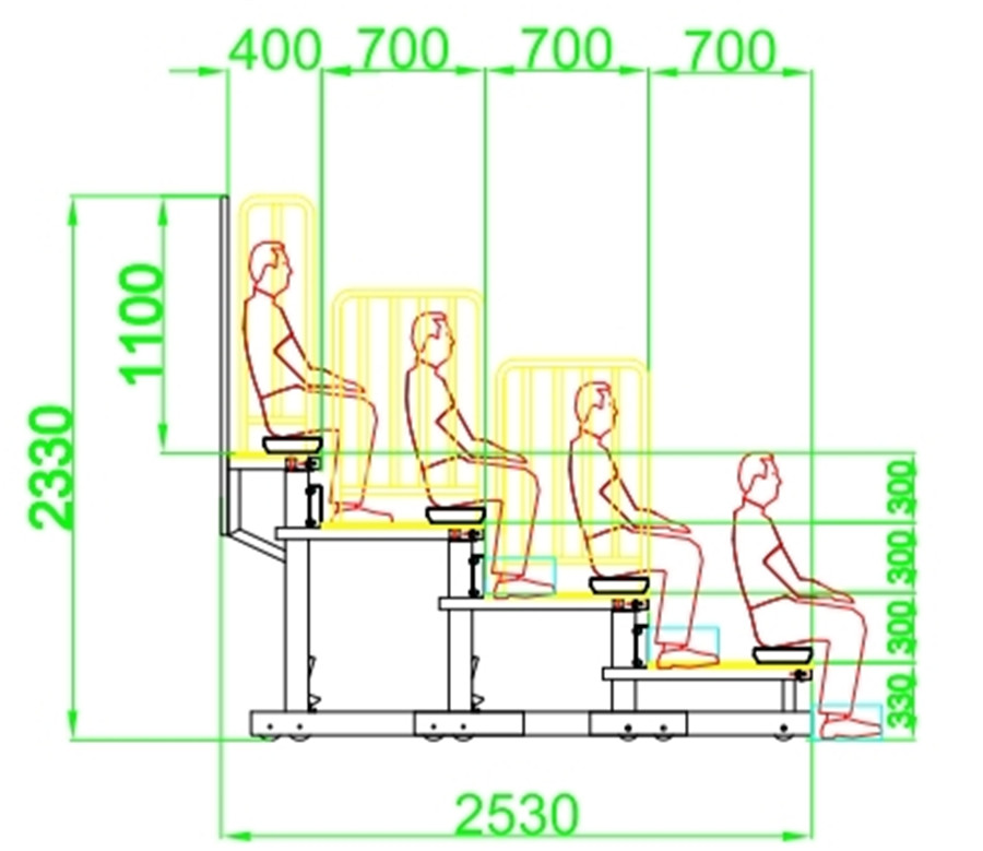 2)看台整体为垂直支撑结构。看台层宽700mm,尾层宽400mm;首层高330mm,其他300mm。伸缩看台为定制产品,可根据实际场地和客户需求,略微调整尺寸。