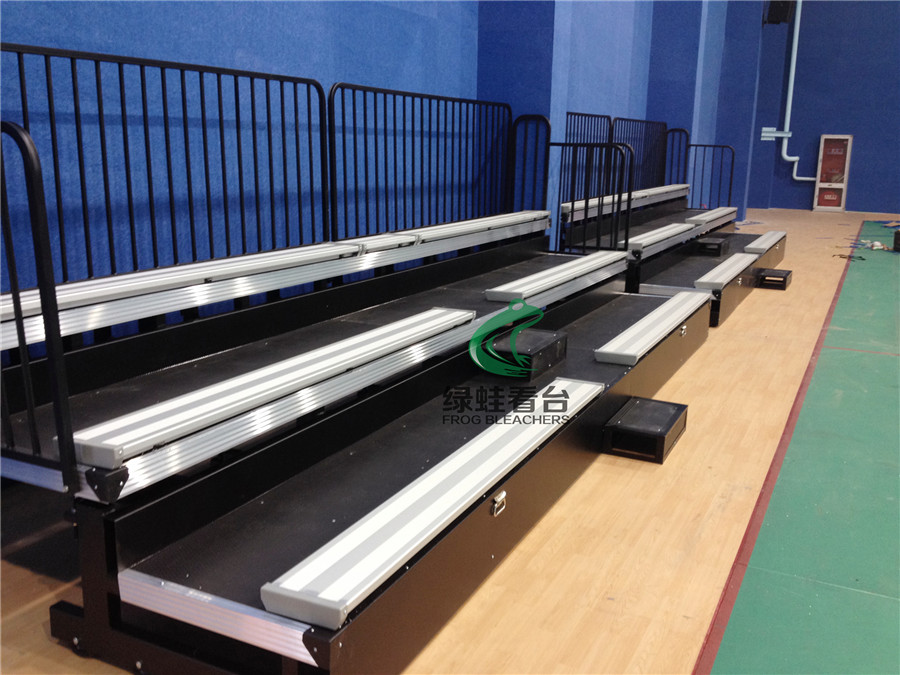 看台上需留出纵向疏散通道,通道应符合疏散要求。每层通道处, 安装一级踏步箱体,箱体采用 17mm 防滑舞台板,外形尺寸:1000mm×300mm×150mm,踏步外露的边均采用铝合金材料包边,外露的角用注塑护角包围,确保踏步箱体美观大方安全。