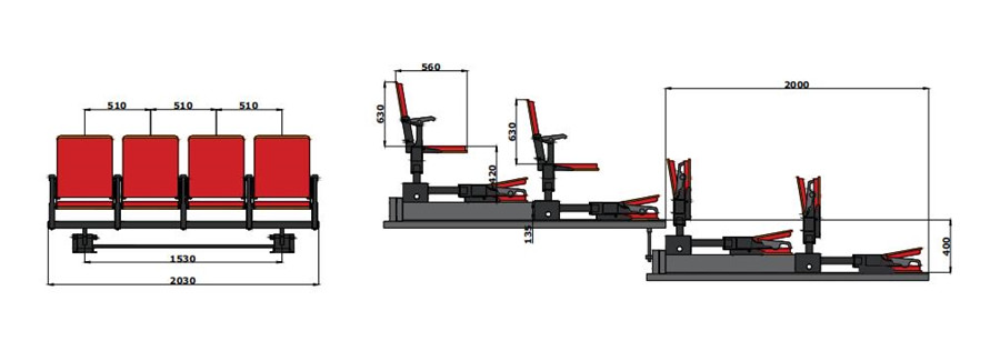 2、 座椅外形尺寸:510W×560D×630H。允许正负10mm的偏离。座椅安装间距510mm。