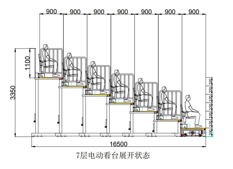 (2)看台整体为垂直支撑结构。看台层宽900mm,尾层宽900mm;首层高330mm,其他层高300mm。(伸缩看台为定制产品,可根据实际场地和客户需求,略微调整尺寸。)